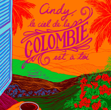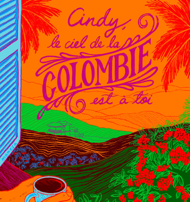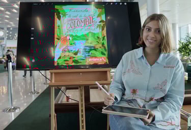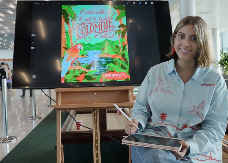 Ilustraciones digitales personalizadas para los pasajeros en el evento de inauguración del primer vuelo de Avianca entre París y Bogotá, realizado en el Aeropuerto Charles de Gaulle en París, Francia.